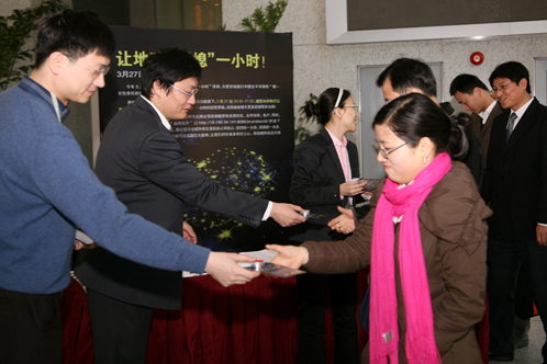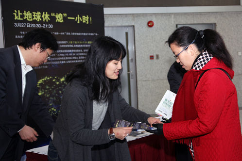 2010年3月26日一早,太平洋保險(xiǎn)的志愿者在總部大樓向員工發(fā)放“地球一小時(shí)”活動(dòng)宣傳資料。