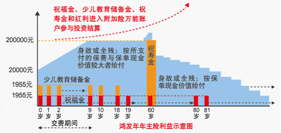 1、祝福金:自合同生效日起及以后的每個合同生效日對應(yīng)日,每年可領(lǐng)取1955元祝福金,直至終身。