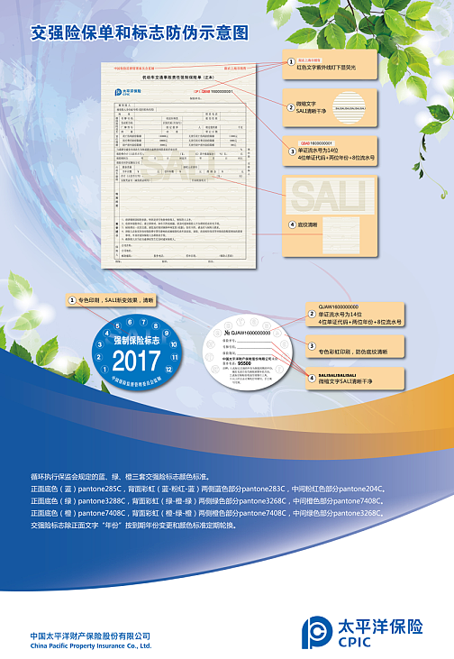 一看,識別單證真?zhèn)?。要仔?xì)辨別單證是否具有監(jiān)管要求的防偽技術(shù)。一是,交強險單證正本左上角“中國保險監(jiān)督管理委員會監(jiān)制”、右上角“限在×××銷售”字樣,并應(yīng)使用紅色熒光防偽油墨,在紫外燈下發(fā)紅色;二是,交強險單證標(biāo)題下有一條以“SALI”為內(nèi)容的微縮文字形成的橫線,與標(biāo)題等長,在5-10倍以上放大鏡下清楚可辨;三是,交強險單證滿版由轎車和貨車圖案做浮雕底紋,中間可見光柵效果的“SALI”四個字母。