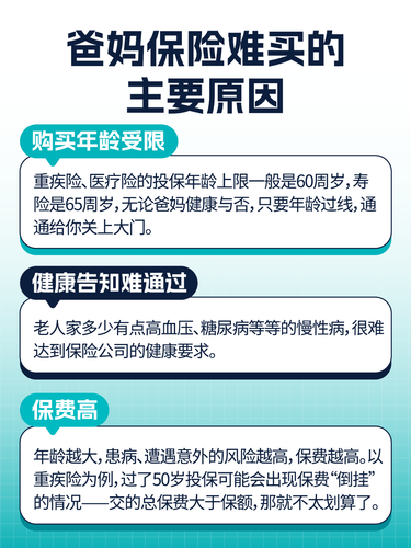 很多朋友都有這樣的經(jīng)歷: 想給50歲以上的爸媽買(mǎi)保險(xiǎn),又難又貴!