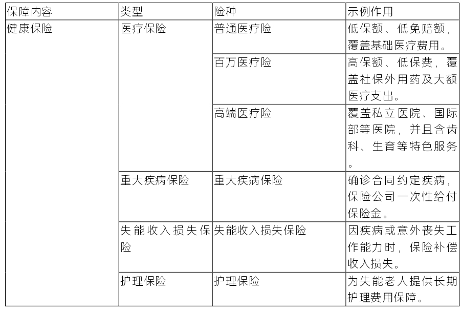 2.健康保險可以分為醫(yī)療保險、重大疾病保險、失能收入損失保險以及護理保險。
